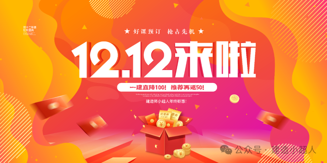 12.12当天,小超人25年一、二建全程班班型震撼来袭,购课优惠券等你来拿,一建499元双十二当天直降100元!,二建直降50元!还有额外的推荐奖励等你来拿!